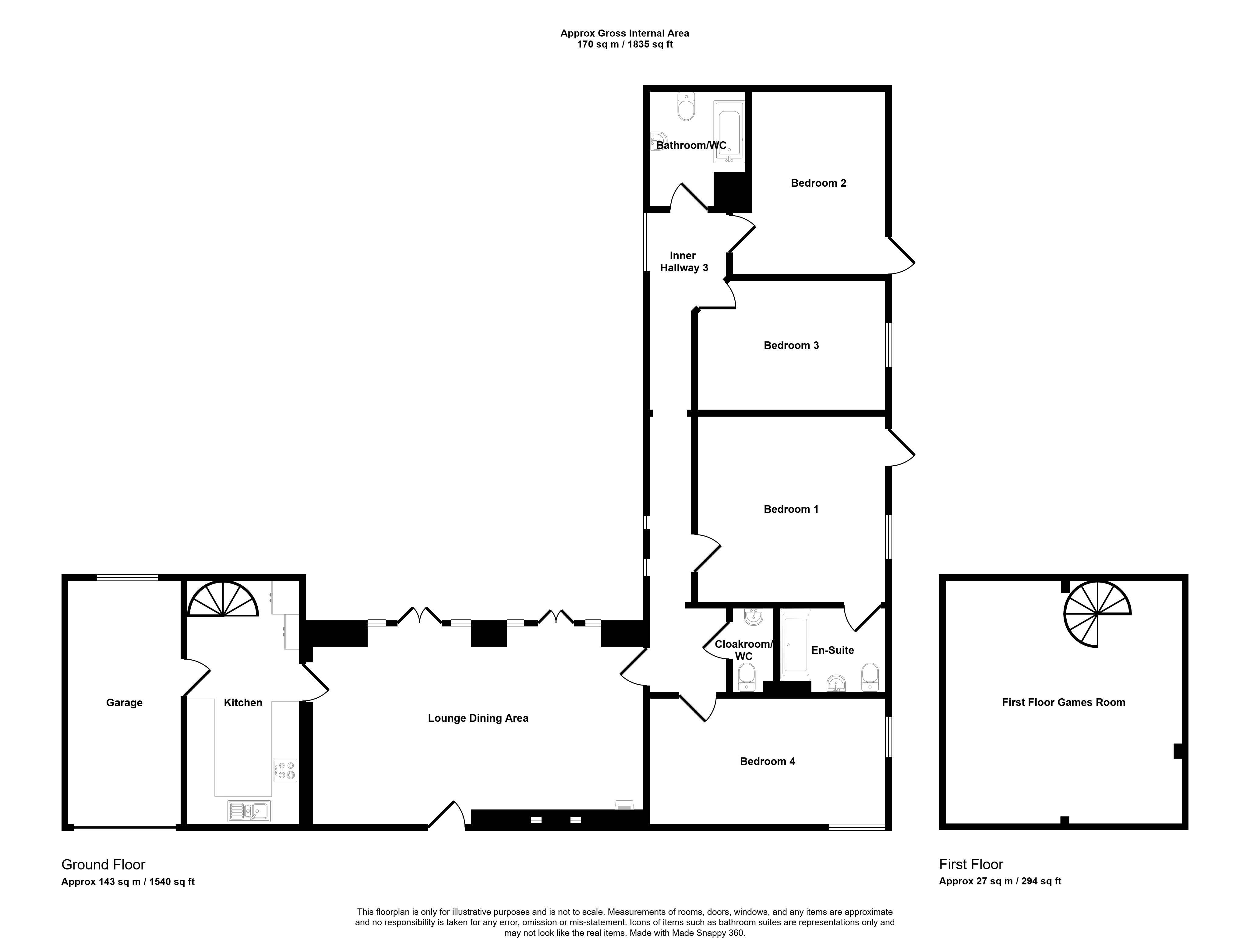 Inner Hallway Doors lead to the four bedrooms, family bathroom/WC and cloakroom/WC. Double glazed windows to the side and radiators.
